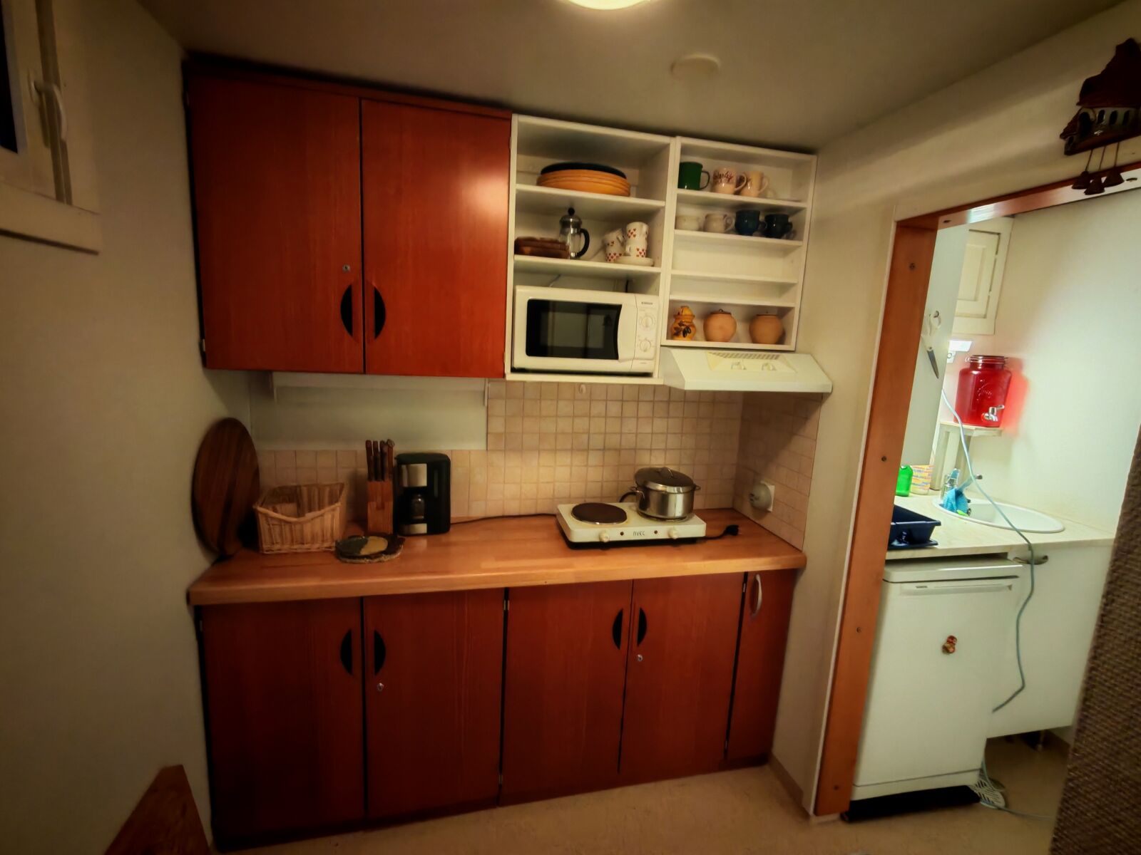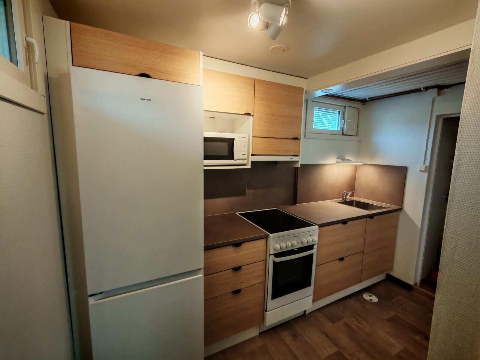Hiljattain valmistui siirtolapuutarhamökkiin keittiön remontti. Tila yhtenäistettiin purkamalla pieni väliseinä. Näin saatiin tila selkeäksi ja helpoksi käyttää.