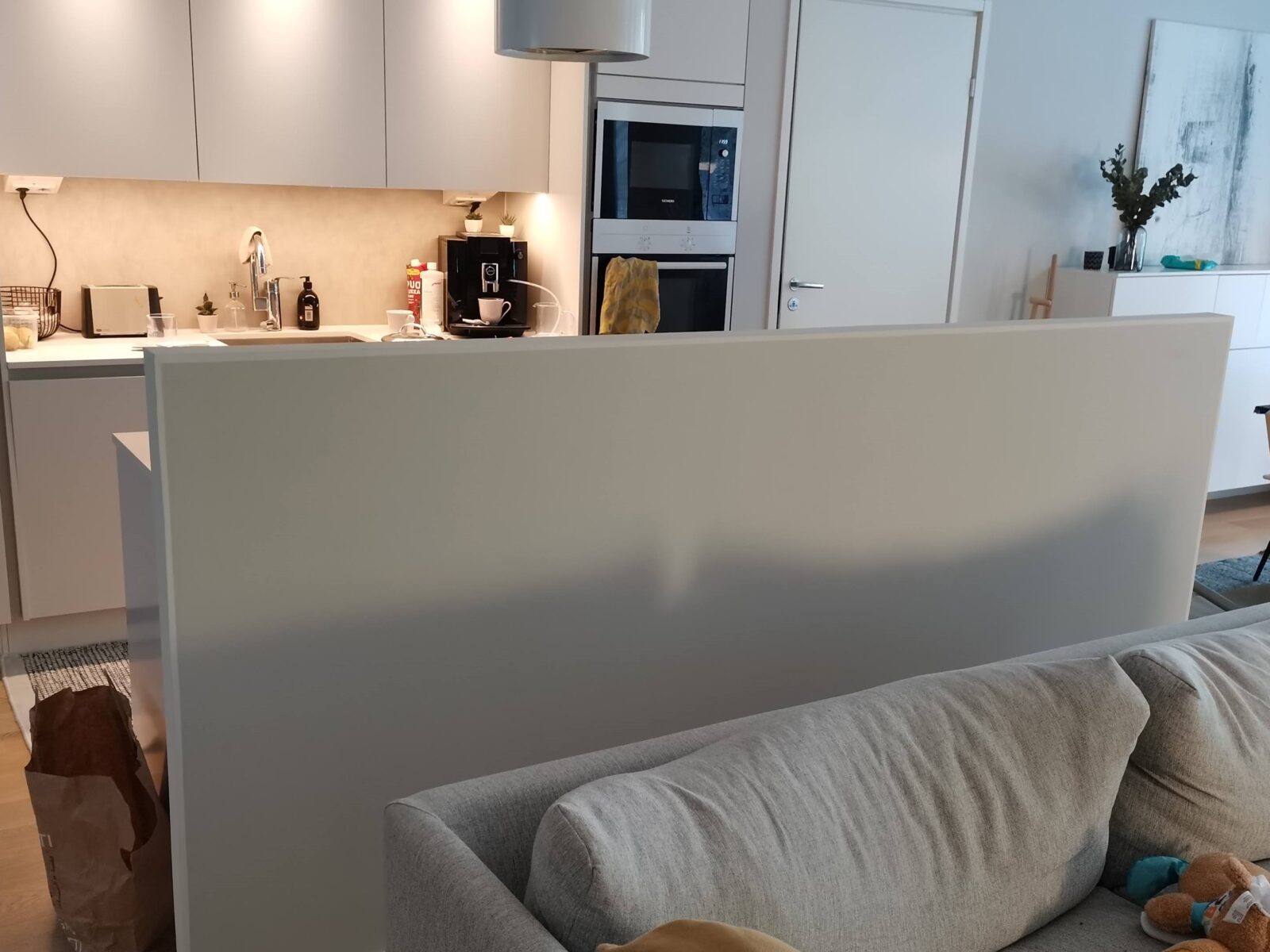 Keittiösaarekkeeseen rakennettiin näyttävä suojaseinä