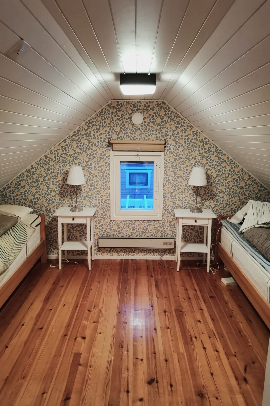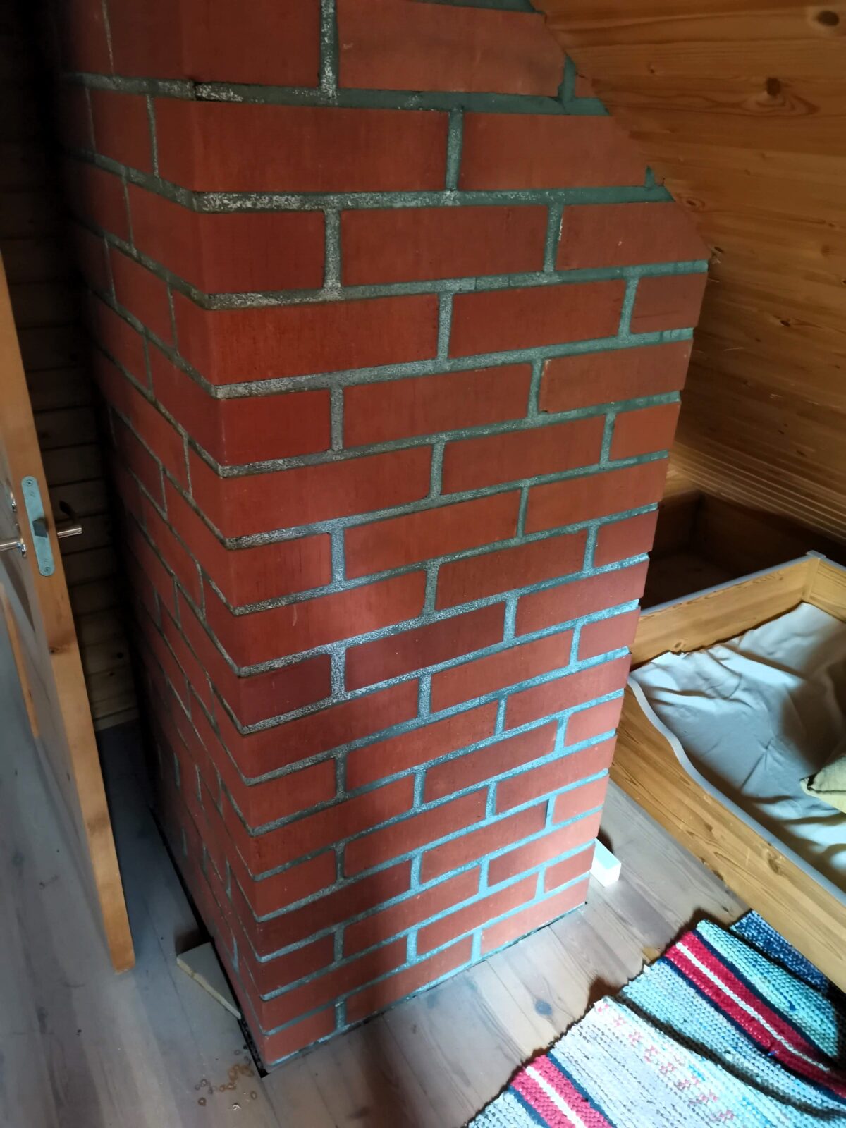 Yläkerran seiniin ja kattoon vaihdettiin villat ja muutenkin tarkistettiin rakenteiden kunto, erityisesti yläpohjan riittävä tuuletus. Katto panelointiin uudelleen valkoisella paneelilla ja päätyseinät levytettiin, sekä tapetoitiin. Piippu tasoitettiin ja pinnoitettiin valkoisella laastilla. Myöskin kaide sai raikkaamman ilmeen.