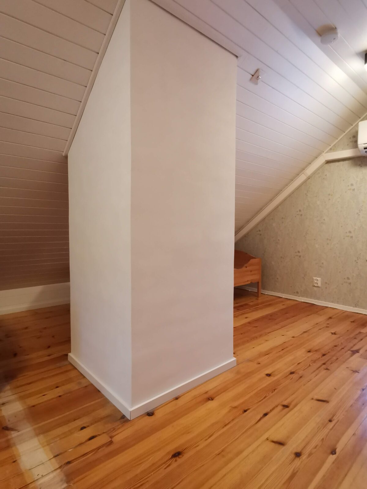 Yläkerta purettiin kokonaan. Yläkerta oli jaettu kahteen huoneeseen, sekä toisessa huoneessa oli matalassa osuudessa vielä kotelointi. Nämä purettiin, jotta pieni yläkerta olisi avarampi.